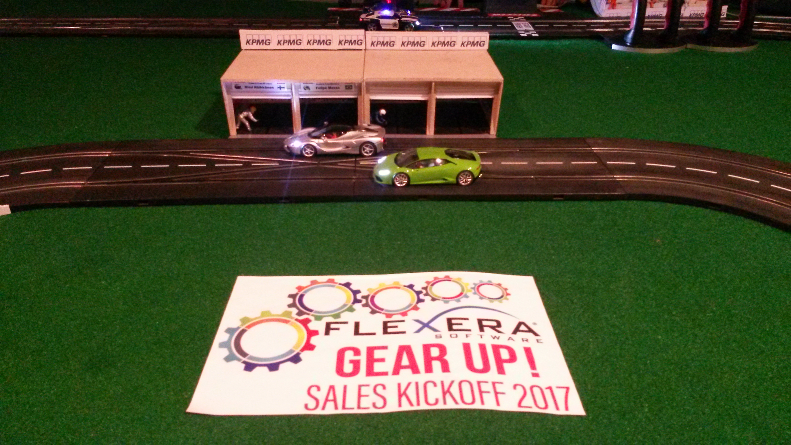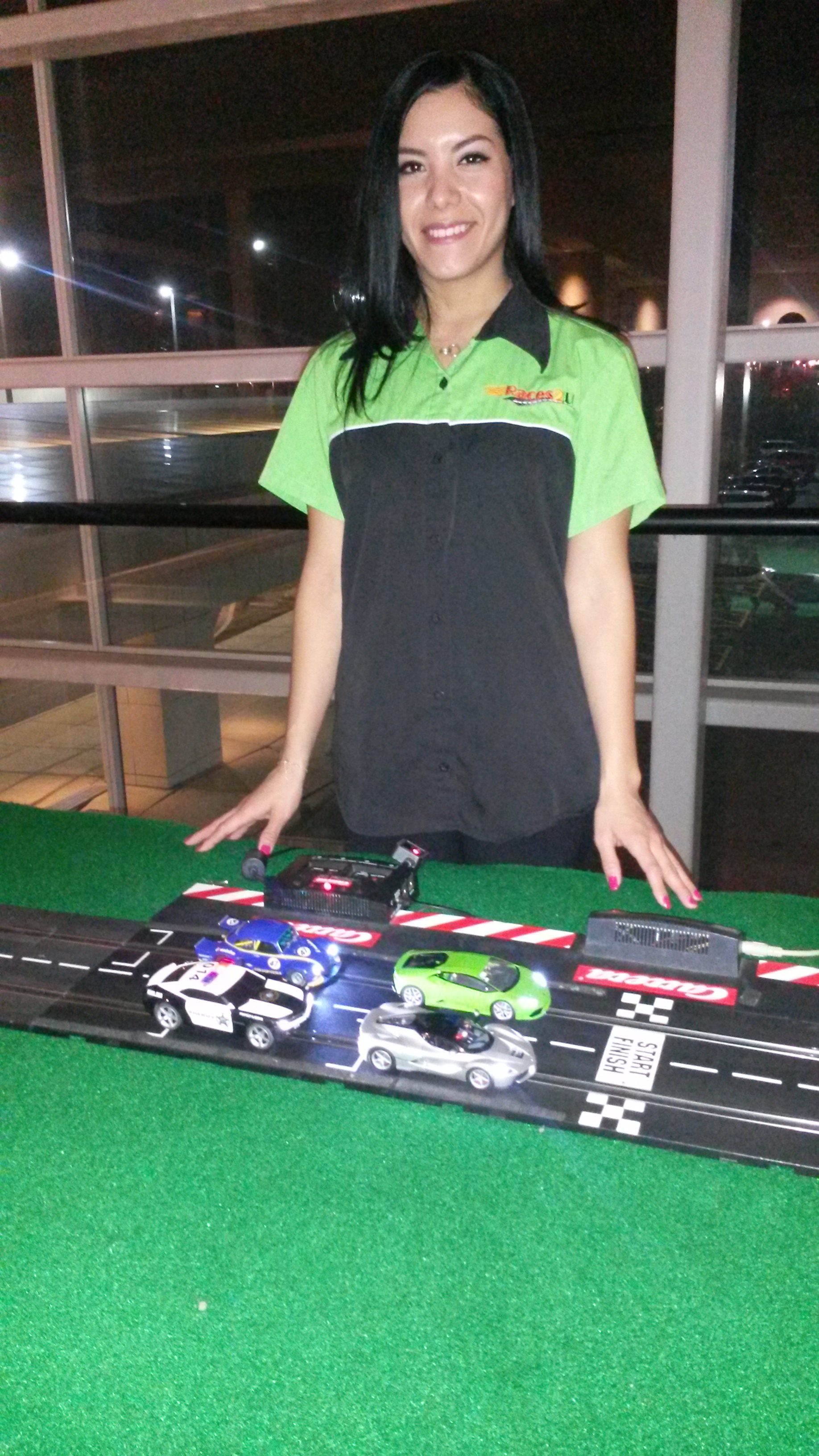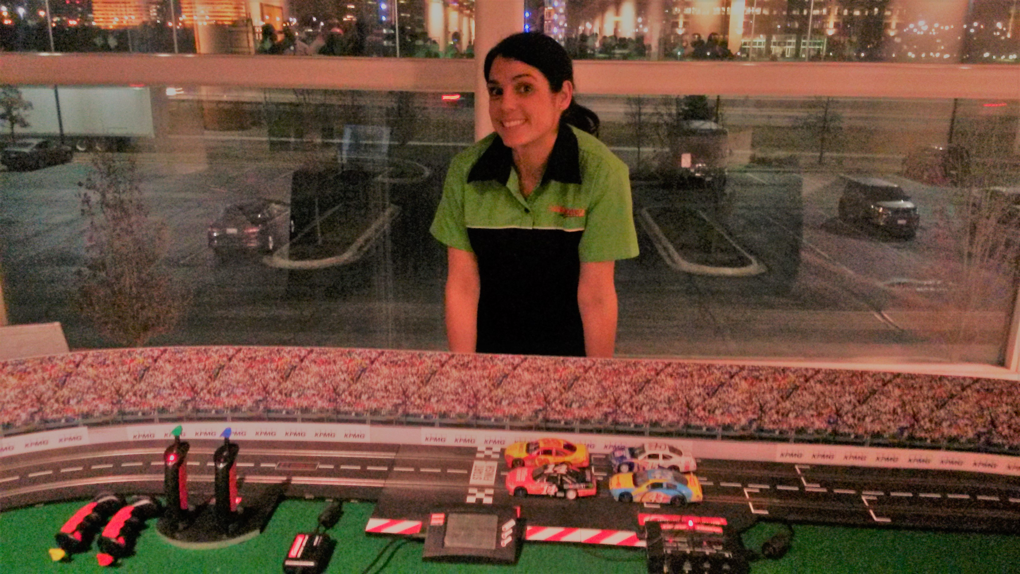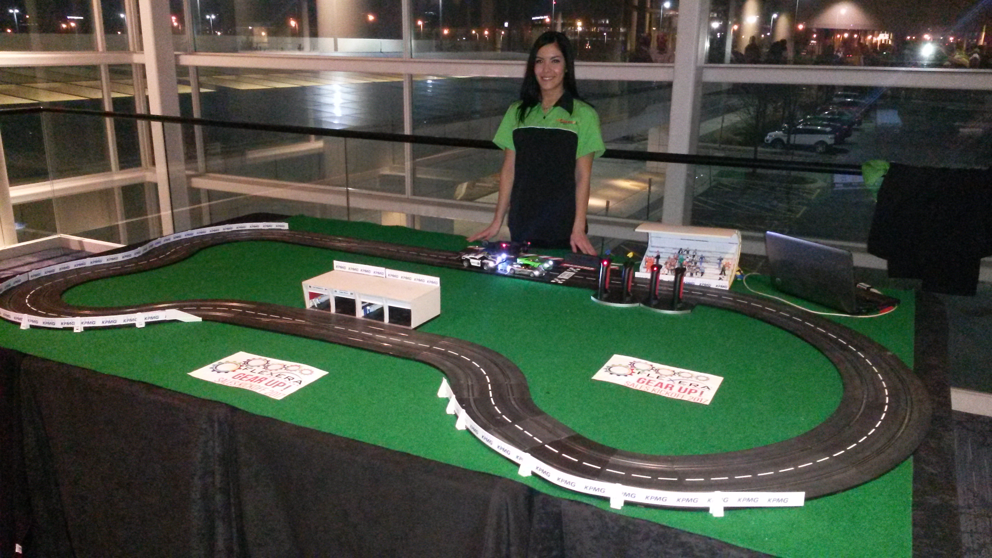 Races2U was recently hired to set up a couple of slot car tracks at Flexera Software’s annual sales meeting in Schaumburg, Illinois, a large suburb of Chicago. At first we were a little nervous, as a Texas based company, most of our personnel don’t have much experience with the harsh winters of the Great Lakes. As it turns out, the weather was wonderful, and we were really warmed up by the great reception we received. We were working with the fantastic event planners from Plan On It, and they did an amazing job of putting on this multi-day event for this international Fortune 500 company. There was delicious food and drink, and of course our racing was a part of the entertainment. It was really a privilege to entertain so many great people from all over the world, and we had racers from England, Italy, France, India, and more. It was almost like attending a real Formula 1 race with the international crowd. A big “Thank you!!!” to our wonderful hostesses Lynda and Teresa and the rest of the Plan On It staff, and all the participants from Flexera who raced with us. Our tracks were sponsored by KPMG, and you will note their logo appears all over the track as a thank you for their sponsorship. Of course, we couldn’t have done it without the help of our two amazing “Pit Crew” track attendants, Cierra and Teresa, who kept the races running smoothly.