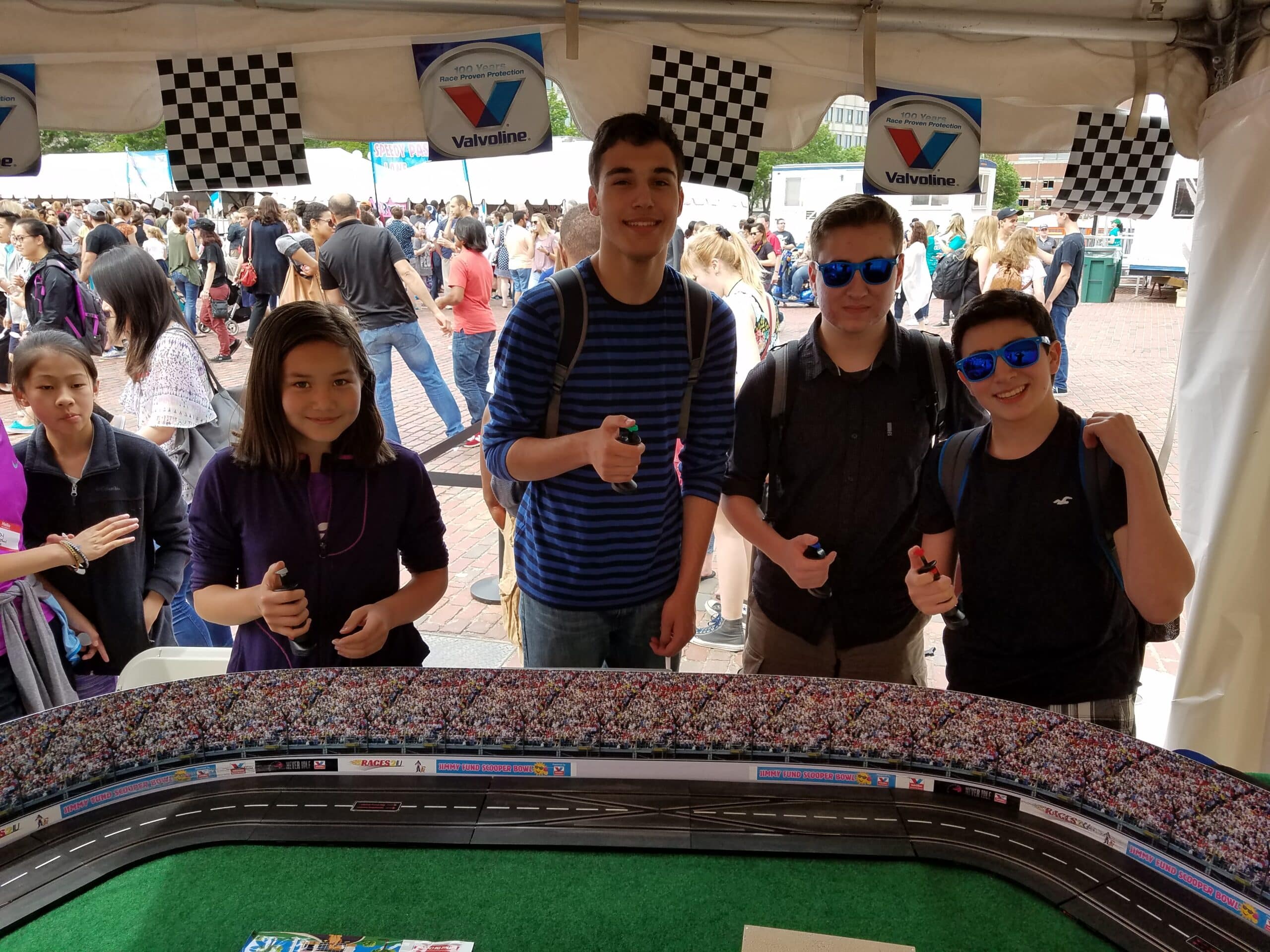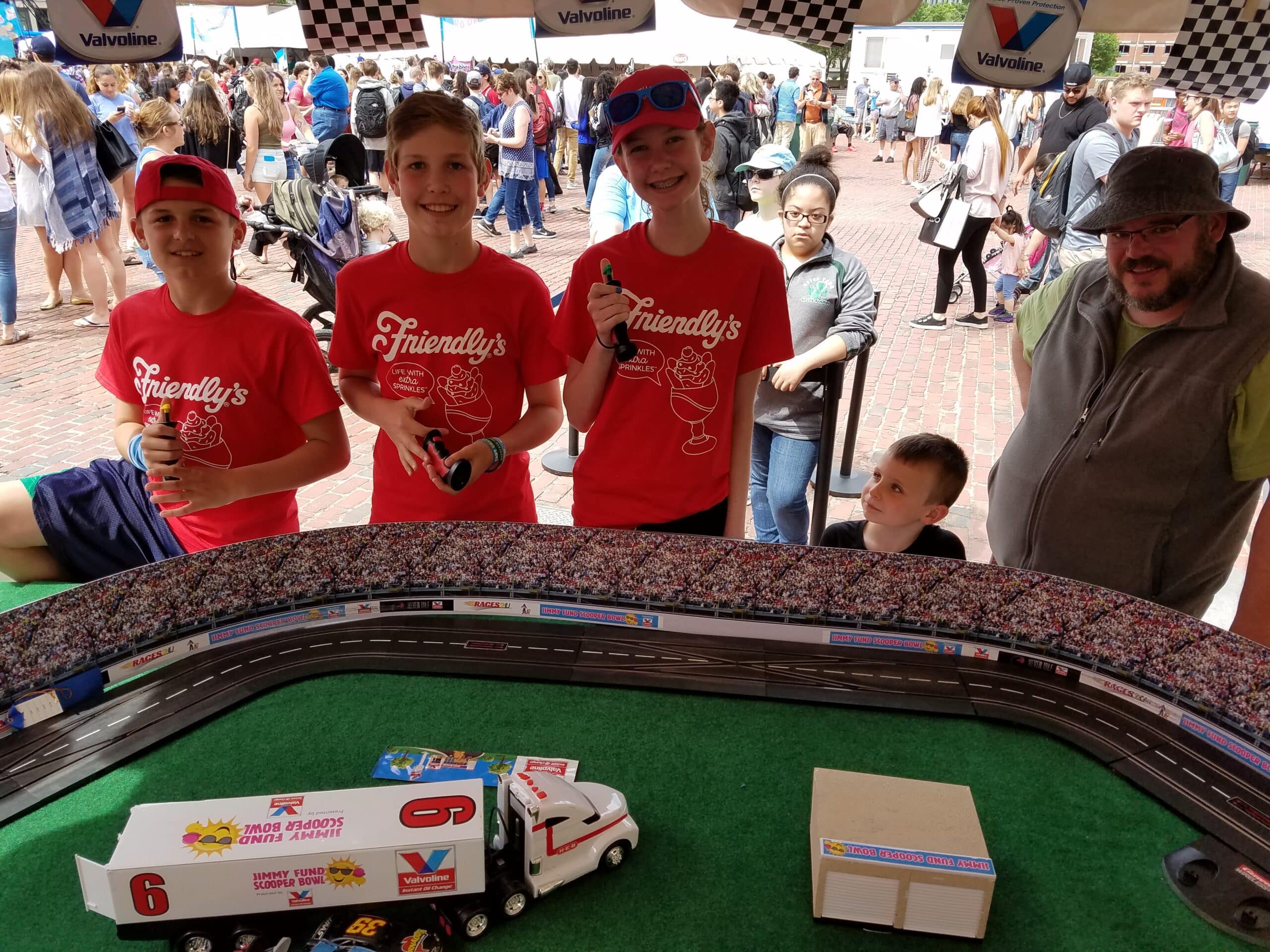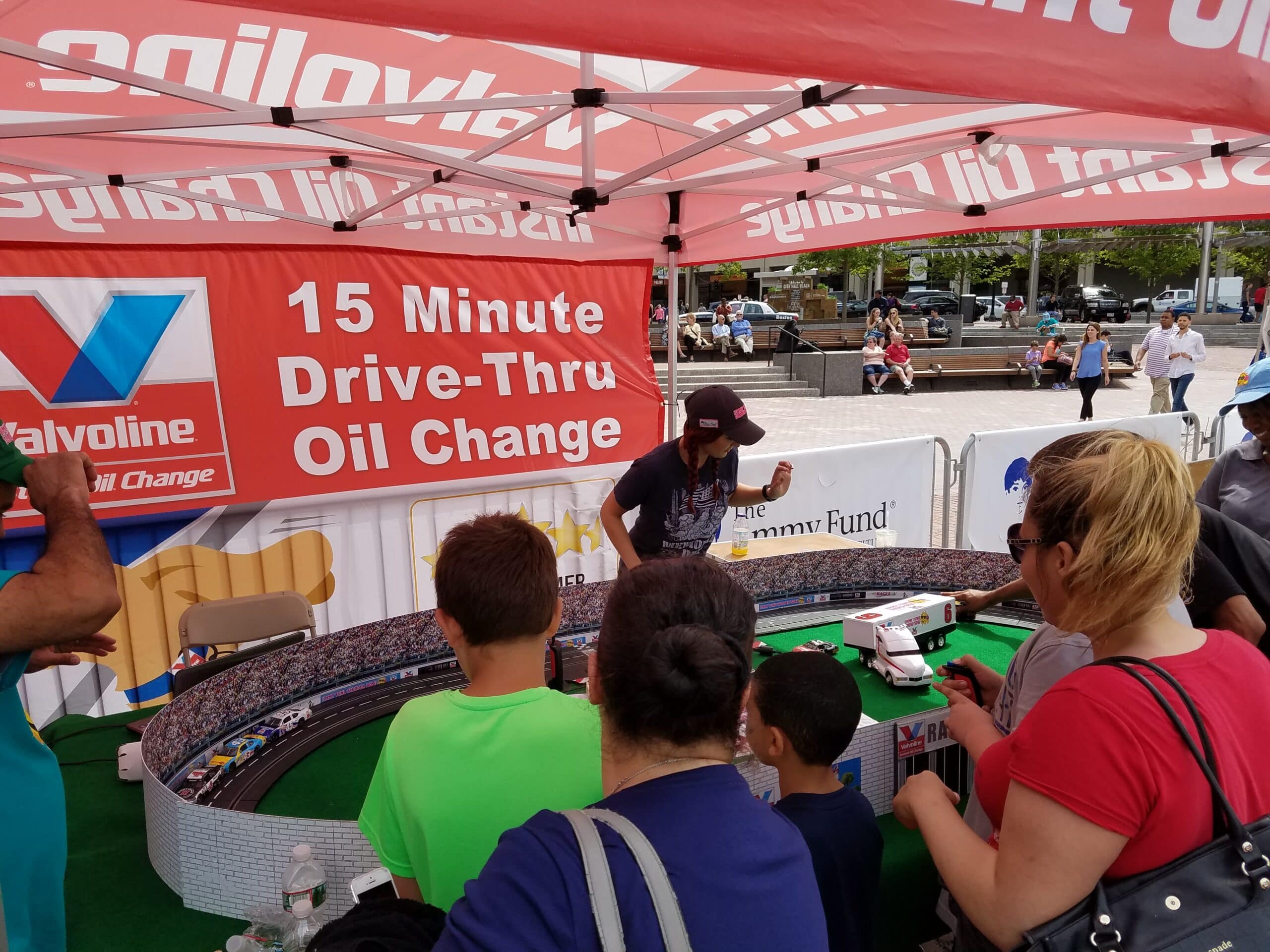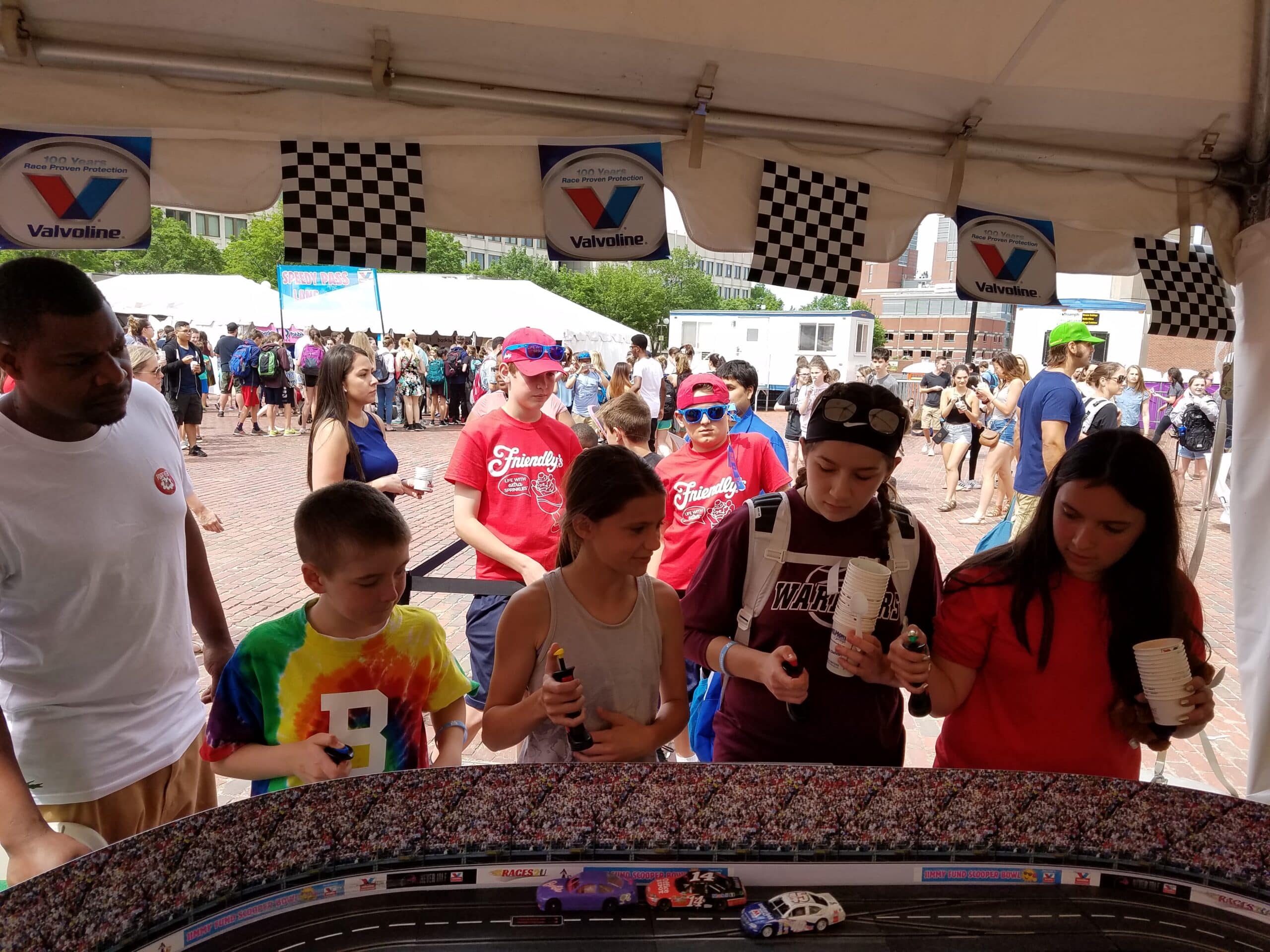 Two things that go well together- slot car racing and ice cream! The Scooper Bowl Ice Cream Festival in Boston is the largest Ice Cream Festival in the US, and raises hundreds of thousands of dollars each year for the Jimmy Fund to search for a cure for children’s cancer. Thank you to our wonderful sponsor, Henley Enterprises Valvoline Instant Oil Change for the opportunity to participate in this fun and worthwhile event. While this year’s event got off to a cold and wet start on the first day, the beautiful weather and huge crowds over the next couple of days more than compensated for the slow beginning. Tens of thousands of people came out to enjoy samples of ice cream from companies like Baskin and Robins, Ben and Jerry’s, Breyers, Edys, Hood, and many more. One of our personal favorites was the frozen Greek Yogurt Bars from Yasso. Thousands of people raced on the two NASCAR tracks we set up, and Warren and Sky and the rest of the Valvoline team were helping kids of all ages race from noon to sundown for the three days of this event. Enjoy the pictures, and look for more on our Facebook page and video on Youtube (coming soon!).