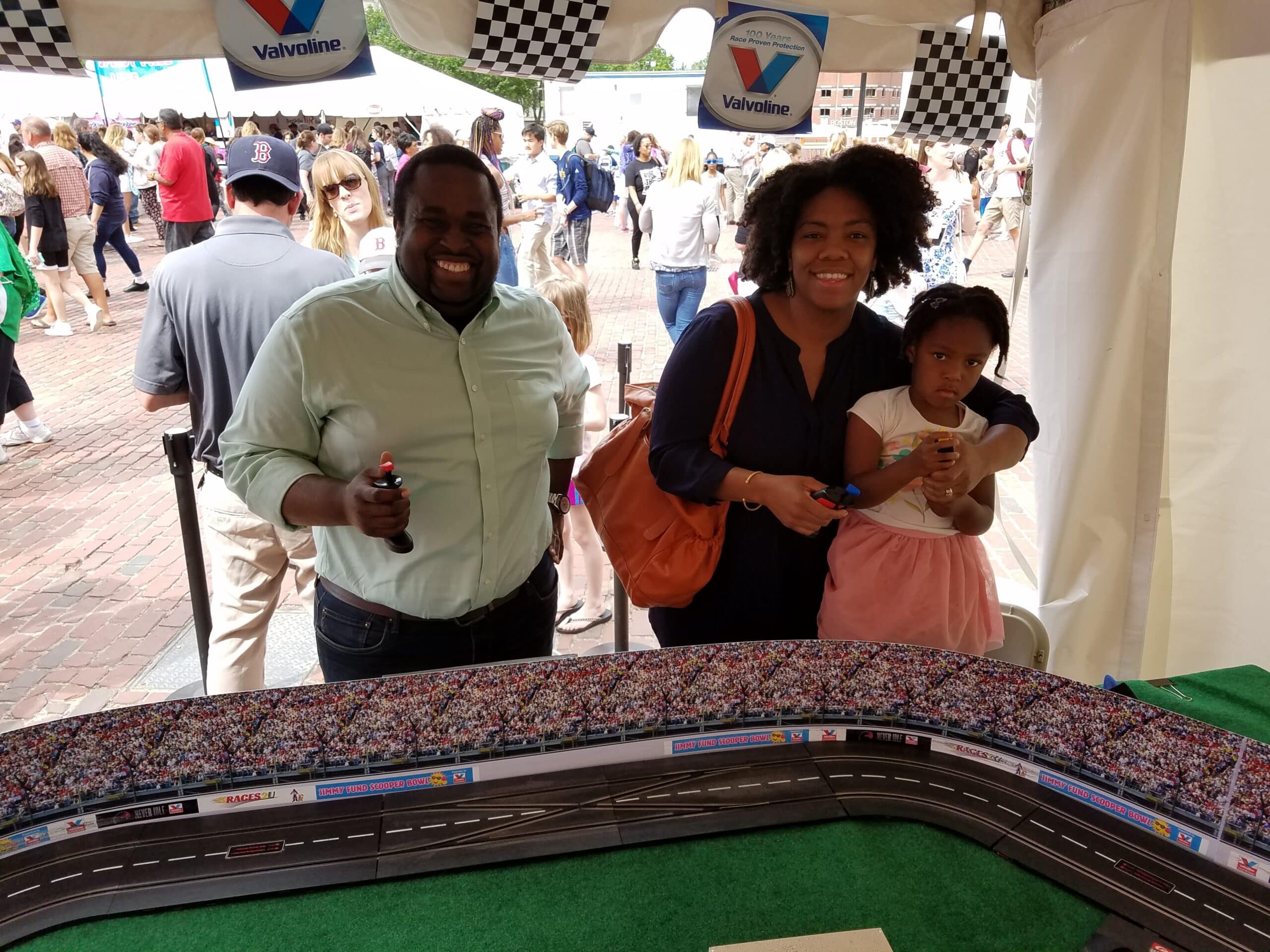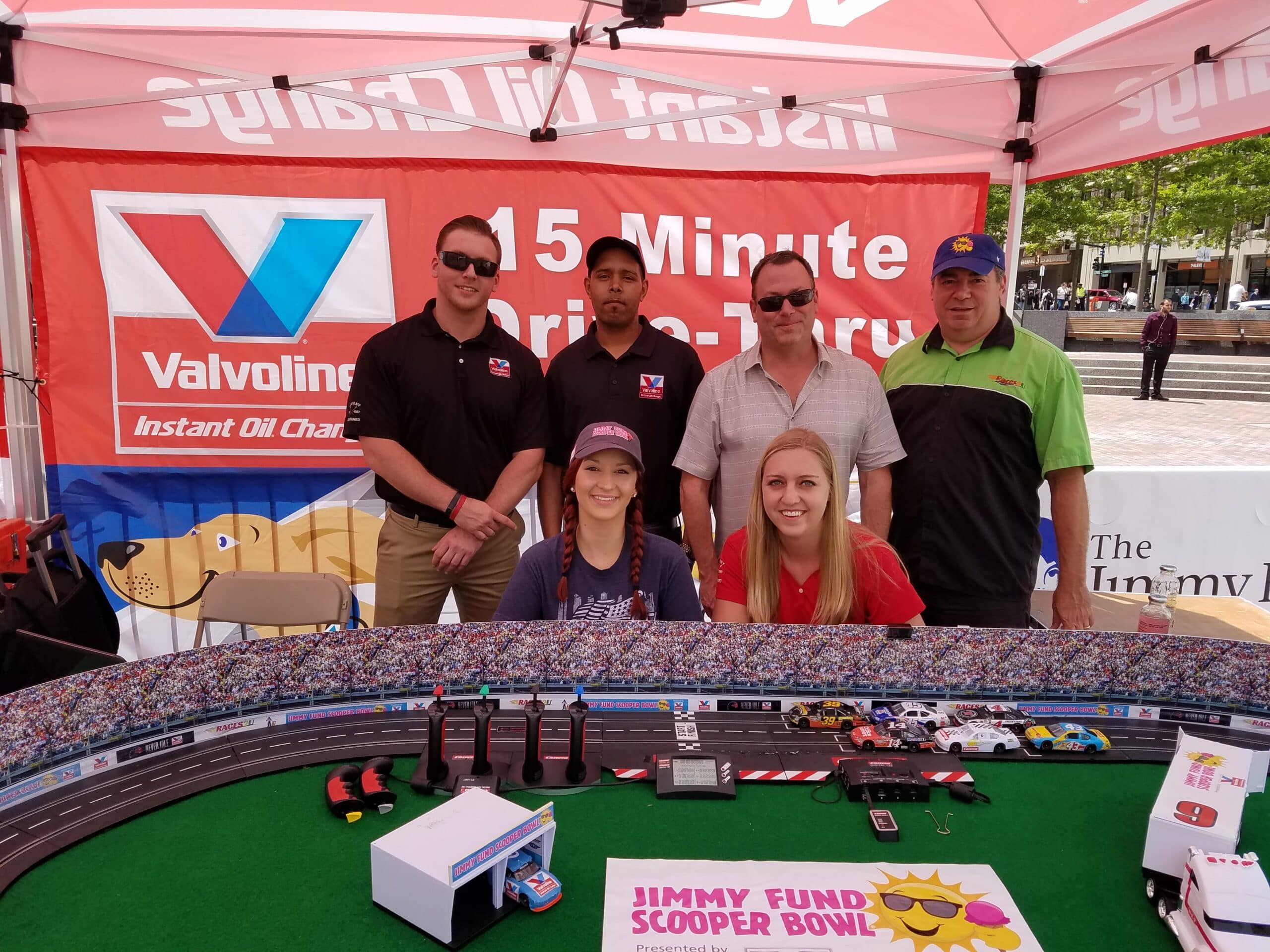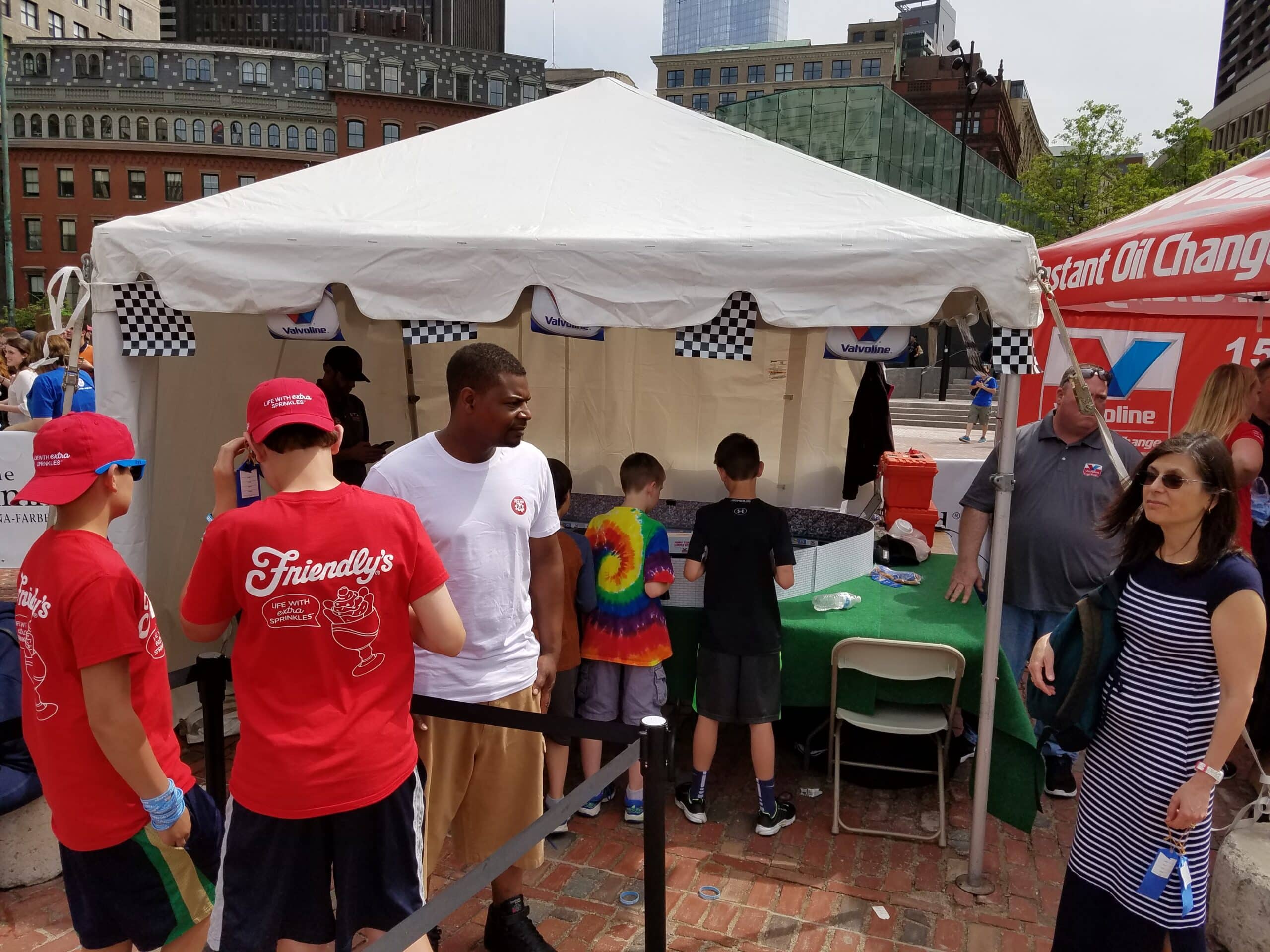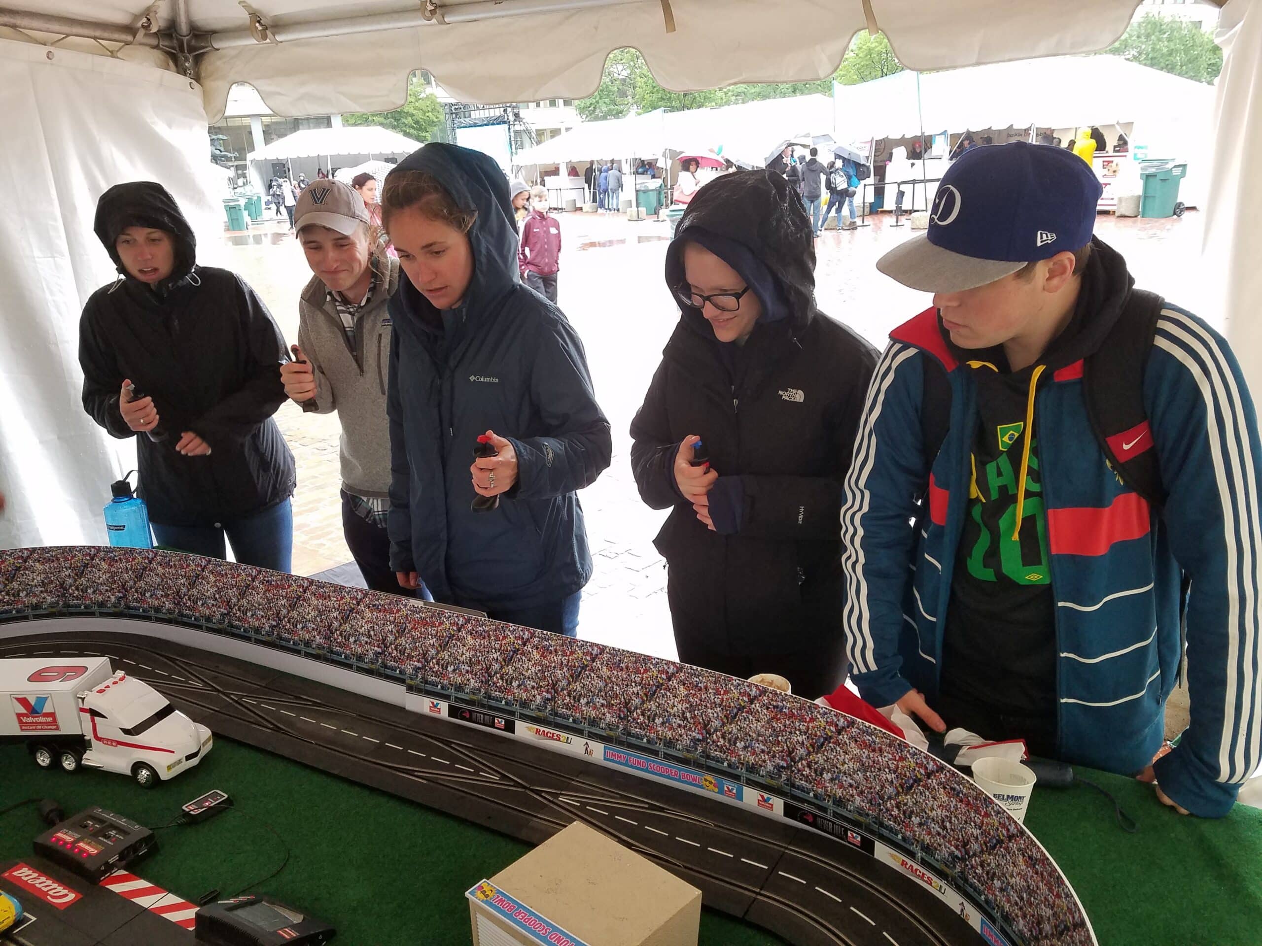 Two things that go well together- slot car racing and ice cream! The Scooper Bowl Ice Cream Festival in Boston is the largest Ice Cream Festival in the US, and raises hundreds of thousands of dollars each year for the Jimmy Fund to search for a cure for children’s cancer. Thank you to our wonderful sponsor, Henley Enterprises Valvoline Instant Oil Change for the opportunity to participate in this fun and worthwhile event. While this year’s event got off to a cold and wet start on the first day, the beautiful weather and huge crowds over the next couple of days more than compensated for the slow beginning. Tens of thousands of people came out to enjoy samples of ice cream from companies like Baskin and Robins, Ben and Jerry’s, Breyers, Edys, Hood, and many more. One of our personal favorites was the frozen Greek Yogurt Bars from Yasso. Thousands of people raced on the two NASCAR tracks we set up, and Warren and Sky and the rest of the Valvoline team were helping kids of all ages race from noon to sundown for the three days of this event. Enjoy the pictures, and look for more on our Facebook page and video on Youtube (coming soon!).